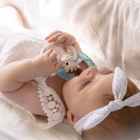 Cet anneau de dentition fresh Sophie la girafe à réfrigérer apaise et stimule les gencives enflammées de bébé.