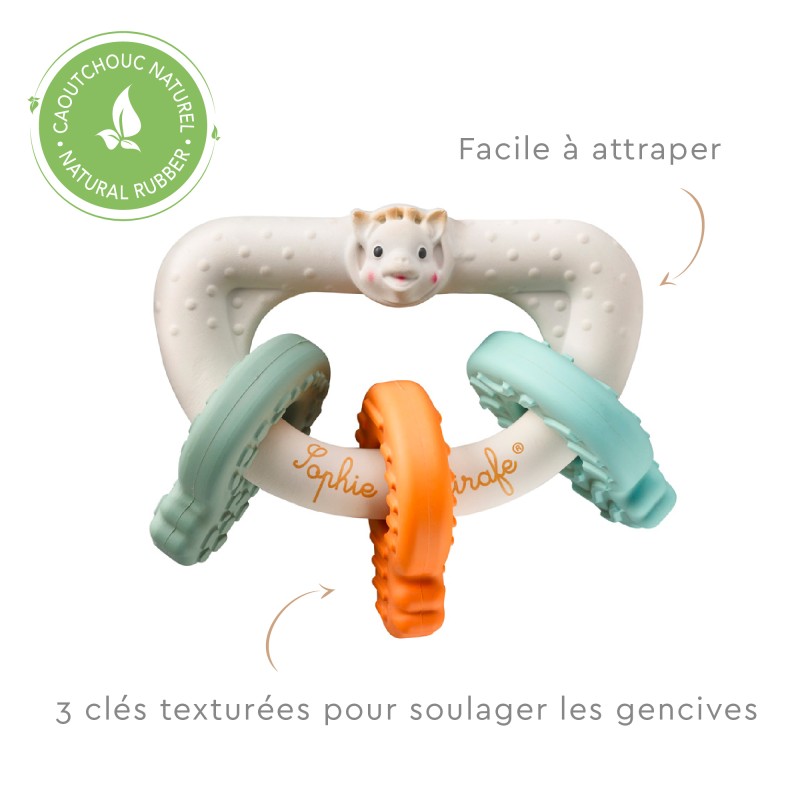 Il est composé de 3 jolies petites clés colorées, faciles à attraper par les petites mains et parfaitement adaptées à la bouche de bébé.