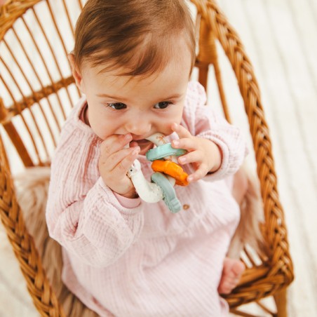 Fabriqué à partir de caoutchouc naturel, cet anneau de dentition a été pensé pour accompagner bébé tout en douceur lors de ses poussées dentaires.