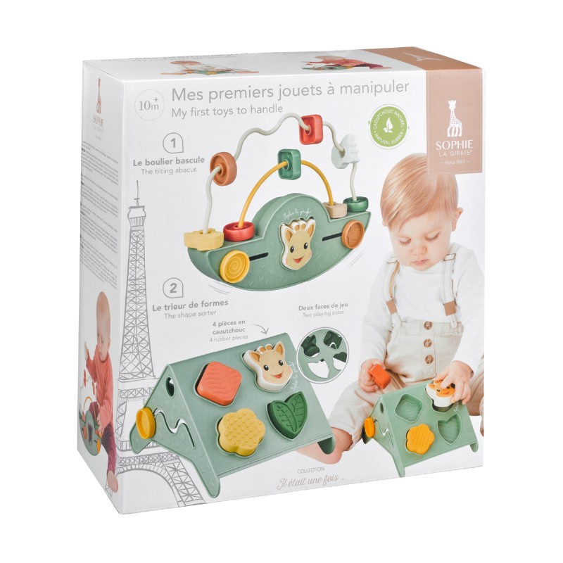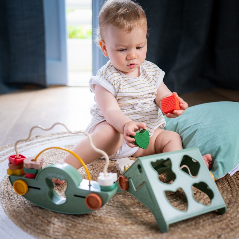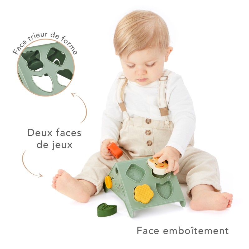- Un trieur de formes 2 en 1 : boîte à formes d’un côté et jeu d'emboîtement de l'autre, avec des glissières à manipuler sur les côtés. Parfaite pour divertir bébé et l’encourager à la résolution de petits défis ludiques.