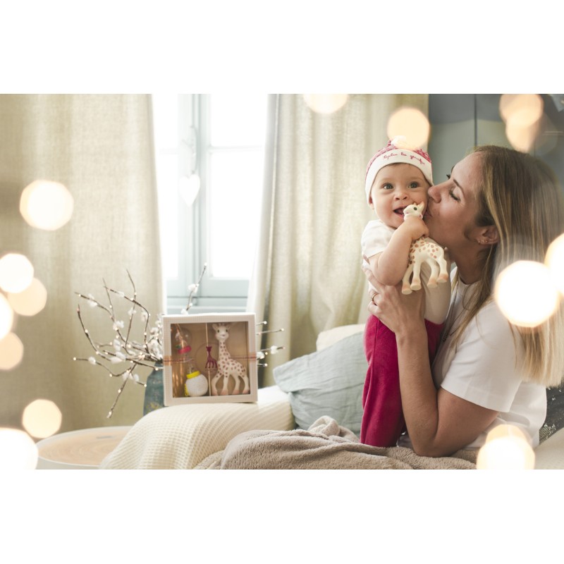 Coffret cadeau accompagné d'un sac cadeau, anses en coton tressé, fermeture par ruban de satin et une carte personnalisable à l'effigie de Sophie la girafe.