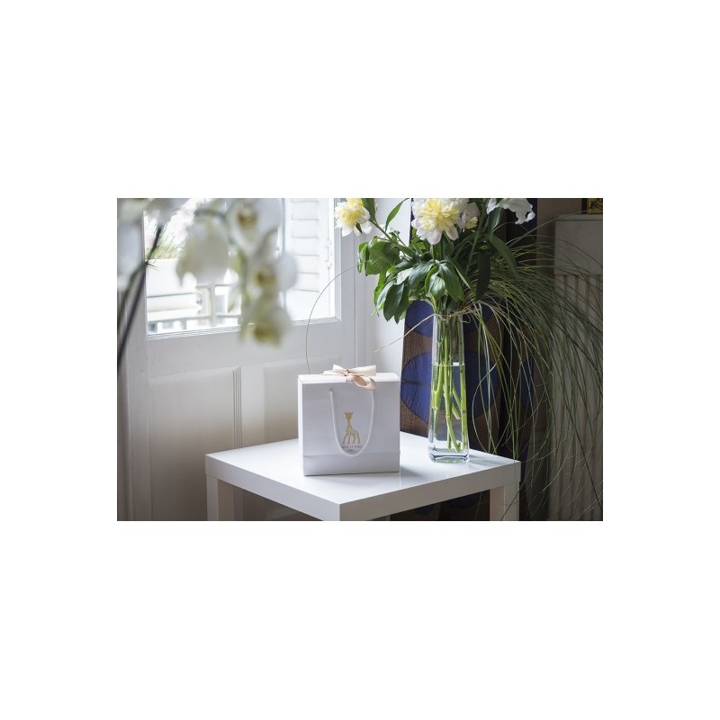 Un écrin transparent et luxueux, accompagné d'un sac cadeau griffé, anses en coton tressé, fermeture par ruban de satin et une carte personnalisable à l'effigie de Sophie la girafe.