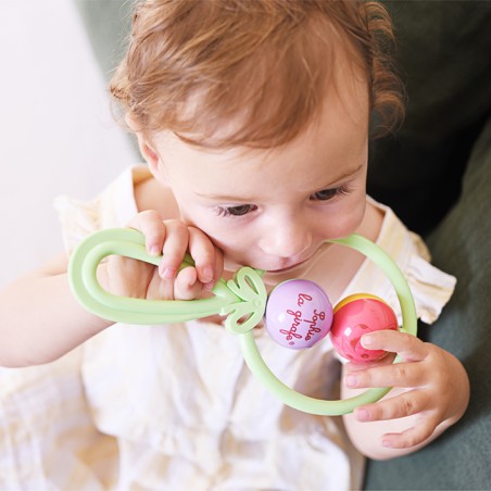 Facile à attraper, à secouer et à mordiller, le Hochet 2 boules accompagne bébé dans ses premières découvertes sensorielles. Il stimule son ouîe, un vrai allié des tout-petits.