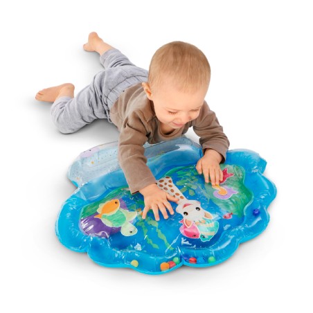 Un tapis d’eau sensoriel ludique conçu pour stimuler le corps et les sens de bébé. Il suffit d’ajouter de l’eau tiède pour faire circuler les petits poissons autour de Sophie, au gré des mains, bras ou pieds de bébé.