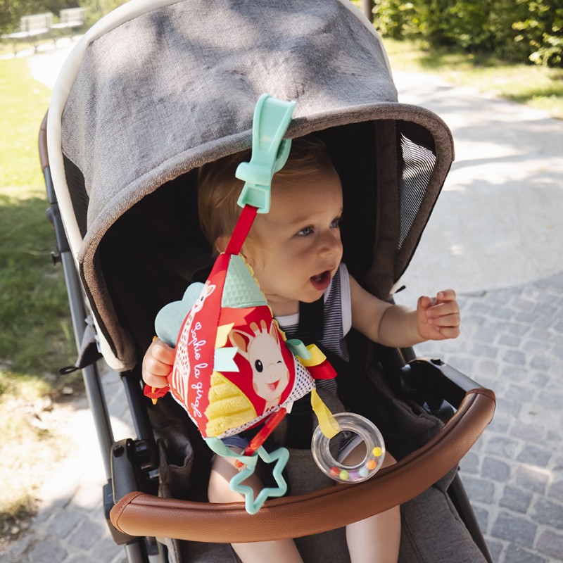Pratique, une pince permet de suspendre la pyramide à de nombreux supports (poussette, barreaux du lit, poignée de voiture…)